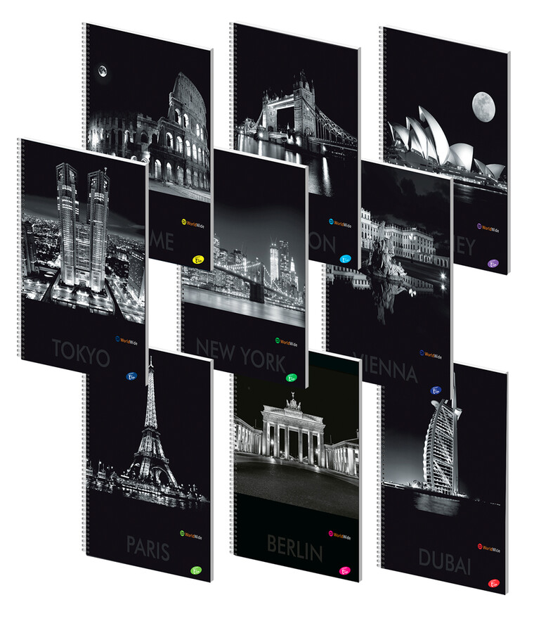 Působivé černobílé fotografie světových metropolí tvoří kolekci obalů kvalitních poznámkových bloků. Pevná obálka s matným povrchem a lesklým lakem zvýrazněnými detaily ve vazbě stříbrné dvojité spirály. Formát bloku A4, 70 listů (papír 70 g), linkovaný.