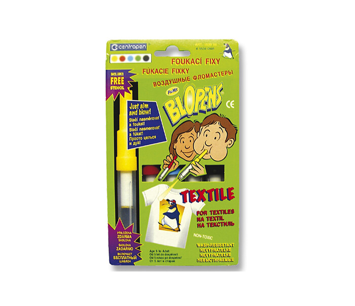 Sada foukacích fixů s vnitřní náplní, které jsou určeny na textil. Náplně obsahují zdravotně nezávadný inkoust. Kresby odolají praní do 60°C. Ventilační chránítko, po použití řádně uzavřít. Balení obsahuje 5 kusů foukacích fixů a 1 šablonu. Mix barev