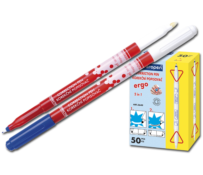 Zmizík na inkousty plnicích per s korektorem na opravu textu. Ergonomický úchop pro lepší držení. Jemný plastový hrot u korektoru a válcový hrot u zmizíku, ventilační chránítka. Jemný hrot Šíře stopy: 0,5mm Válcový hrot Šíře stopy: 1,2mm