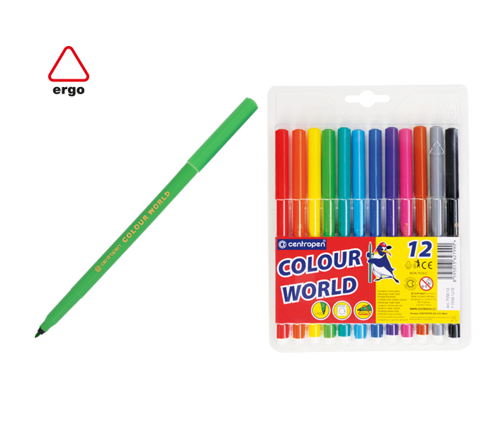 Sada popisovačů s ventilačním bezpečnostním chránítkem, ergonomický úchop pro lepší držení. Jsou vyrobeny z polypropylenu. Zdravotně nezávadný, vypratelný inkoust, odolávají vyschnutí až 5 let. Válcové hroty jsou odolné proti zatlačení. Barvy jsou syté a zářivé. Praktické balení s eurozávěsem. 12 barev Šíře stopy: 1mm Válcový hrot