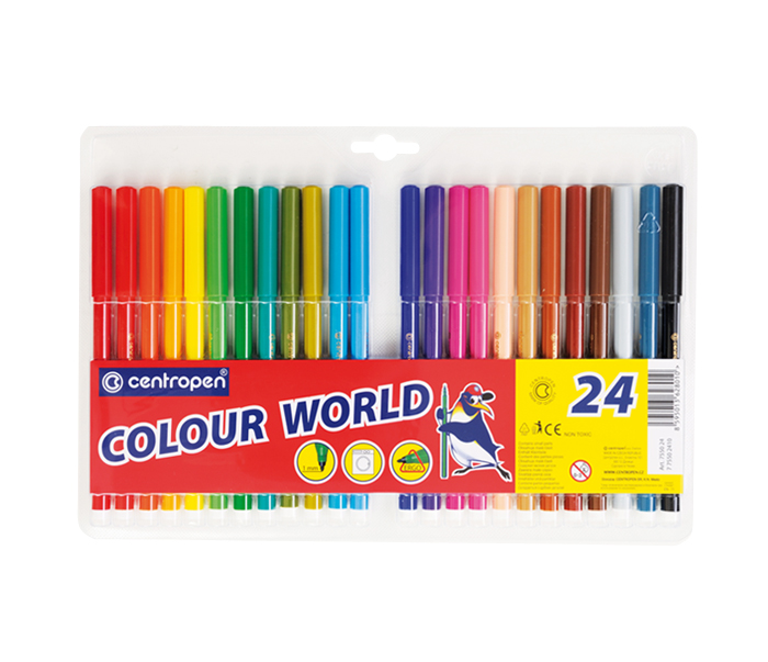 Sada popisovačů s ventilačním bezpečnostním chránítkem, ergonomický úchop pro lepší držení. Jsou vyrobeny z polypropylenu. Zdravotně nezávadný, vypratelný inkoust, odolávají vyschnutí až 5 let. Válcové hroty jsou odolné proti zatlačení. Barvy jsou syté a zářivé. Praktické balení s eurozávěsem. 24 barev Šíře stopy: 1mm Válcový hrot