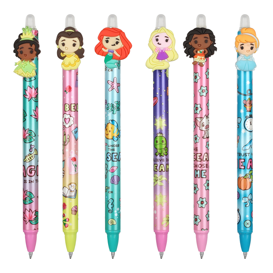 Praktická gumovatelná pera pro děti s měkkou koncovkou a motivy nejznámějších princezen z dílny Walt Disney. Kvalitní inkoust lze v případě potřeby jednoduše vygumovat a přepsat.