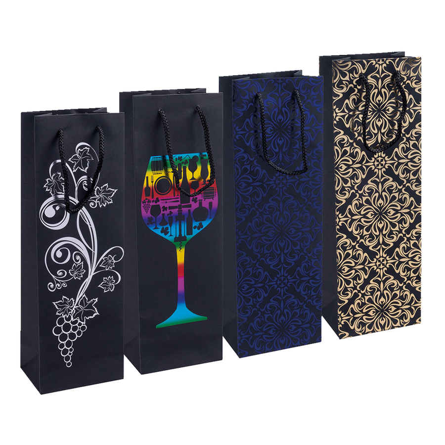 Sada kvalitních dárkových tašek určená pro balení 1 láhve vína či jiného nápoje. Laminovaný povrch je odolný proti oděru a poškození, atraktivní barvy a motivy. Zesílené dno, barevně sladěné pevné šňůrky pro pohodlné přenášení.