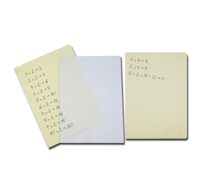 Školní popisovací složka průhledná, mléčné barvy. Dovnitř složky se umístí list např. s textem nebo početními úkoly a obyčejnou tužkou je možné na desky psát resp. doplňovat výsledky příkladů, text ap. Podložku lze lehce vygumovat a opětovně použít. Barva: mléčná Rozměry: 21,6x31,6 cm Tloušťka: 280 mic Formát: A4 Materiál: PVC