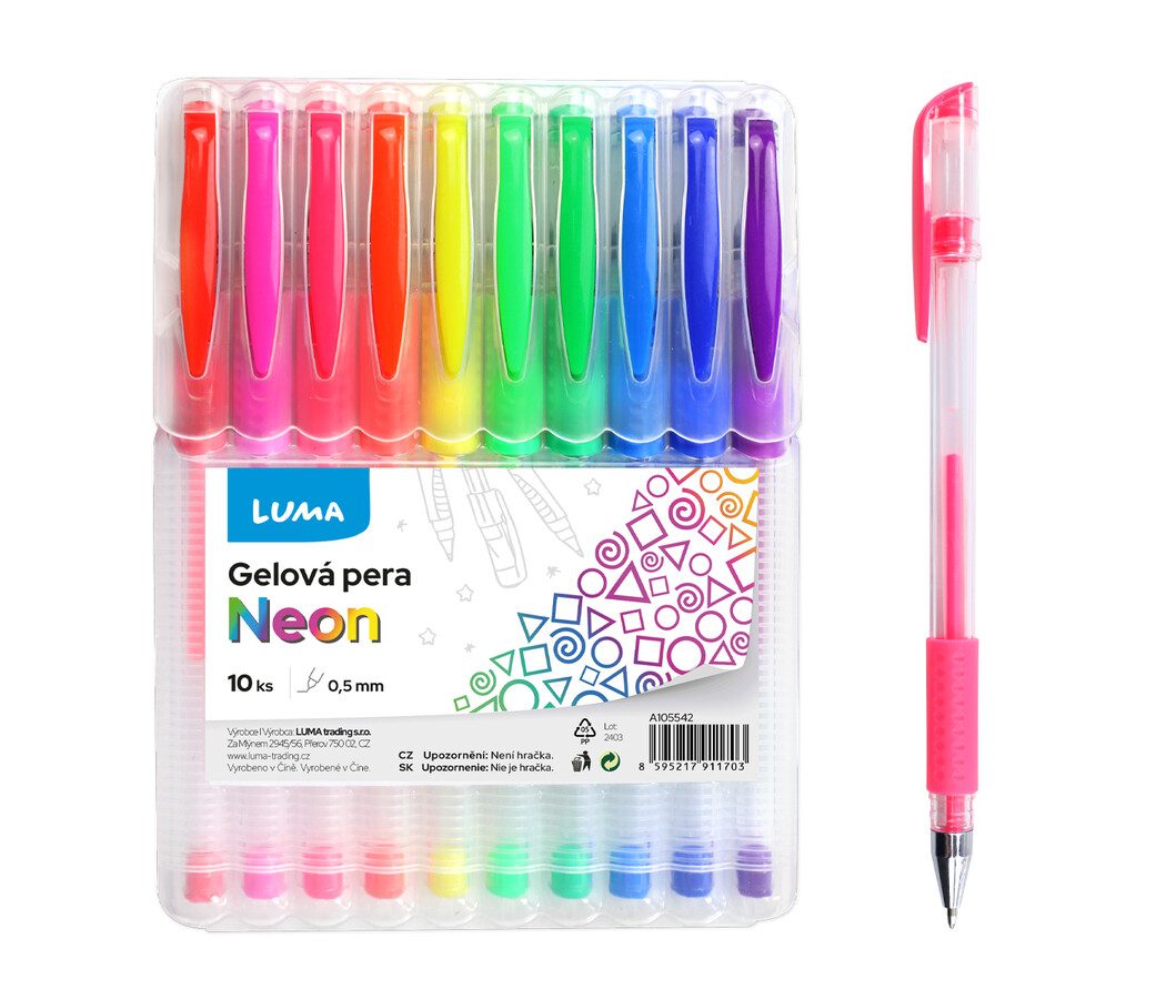 - hladké psaní - METALLIC gelová náplň - šíře stopy 0,5 mm - netoxické - průhledné tělo s uzávěrem - velká kapacita inkoustu - pogumovaný úchop