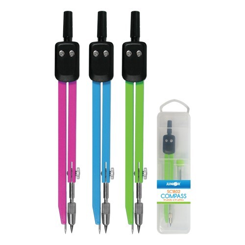Školní kovové kružítko jednoduché, s černým plastovým úchytem. Součástí balení je náhradní tuha. Celý set je balený v praktické plastové krabičce. Kružítko dodáváno ve třech pastelových barvách - modré, zelené, růžové.
