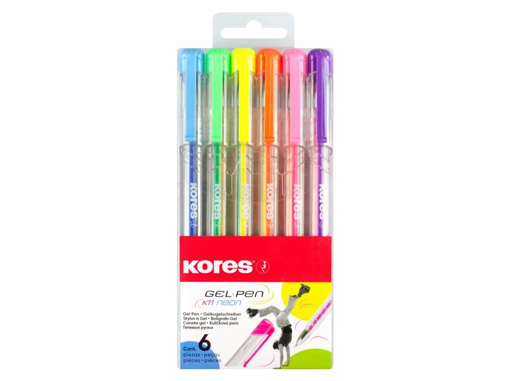 Kores K11 Gel Pen Neon je vysoce kvalitní gelové pero, které píše mimořádně hladce díky gelovému inkoustu s nízkou viskozitou. Sada 6 jasných neonových barev je ideální do školy, kanceláře, hobby použití či dekorování. Šířka stopy činí 0,8 mm. Pro pohodlné používání mají gelová pera KORES trojhranný tvar s gripem pro lepší úchop a lepší psaní či kreslení.