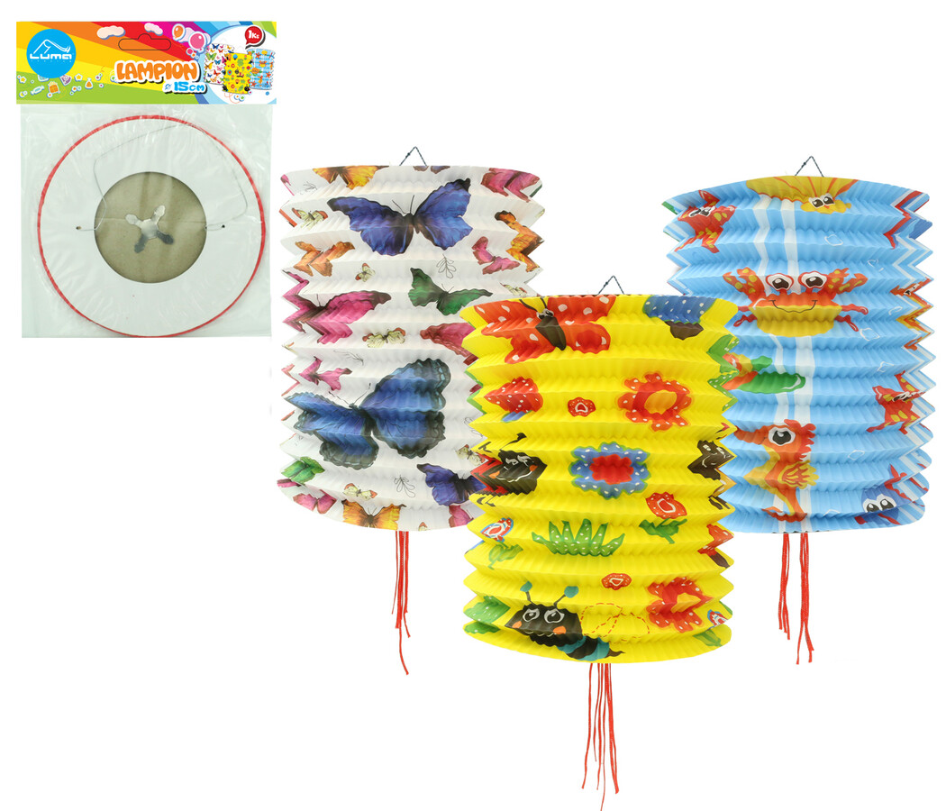 Lampion ve tvaru válce má kovový držák na svíčku a očko na zavěšení. Tyto lampiony jsou to pravé pro skvělou zahradní párty všeho druhu. Klasické lampiony jsou tradiční dekorací, která dodá příjemnou a jedinečnou atmosféru dne. Průměr: 15cm. Mix motivů a barev.