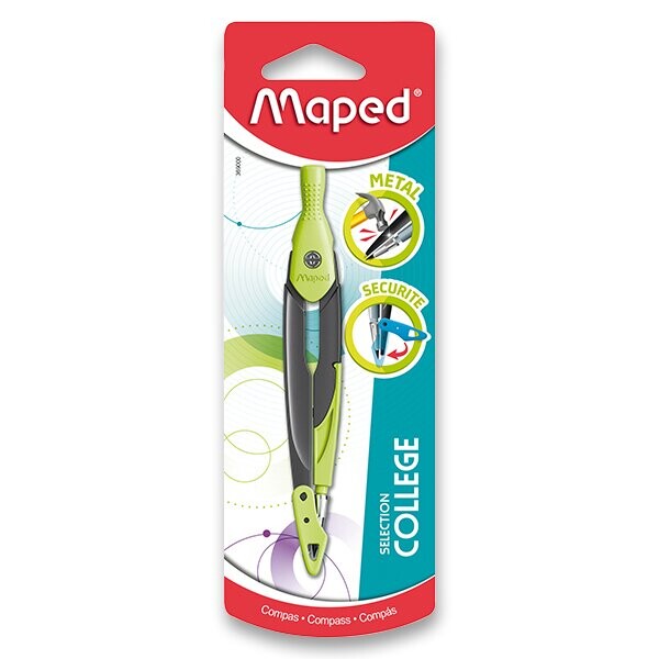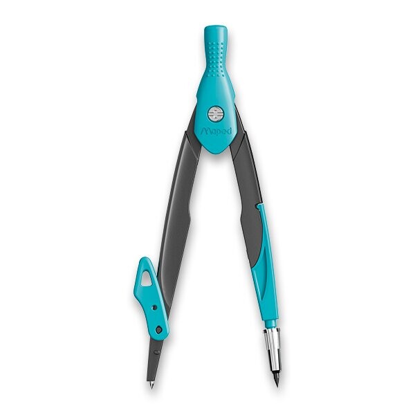 Multifunkční kovové kružítko Maped Metal Open, ergonomický měkký úchop. Kryt jehly a tuhy pro vyšší bezpečnost při manipulaci.