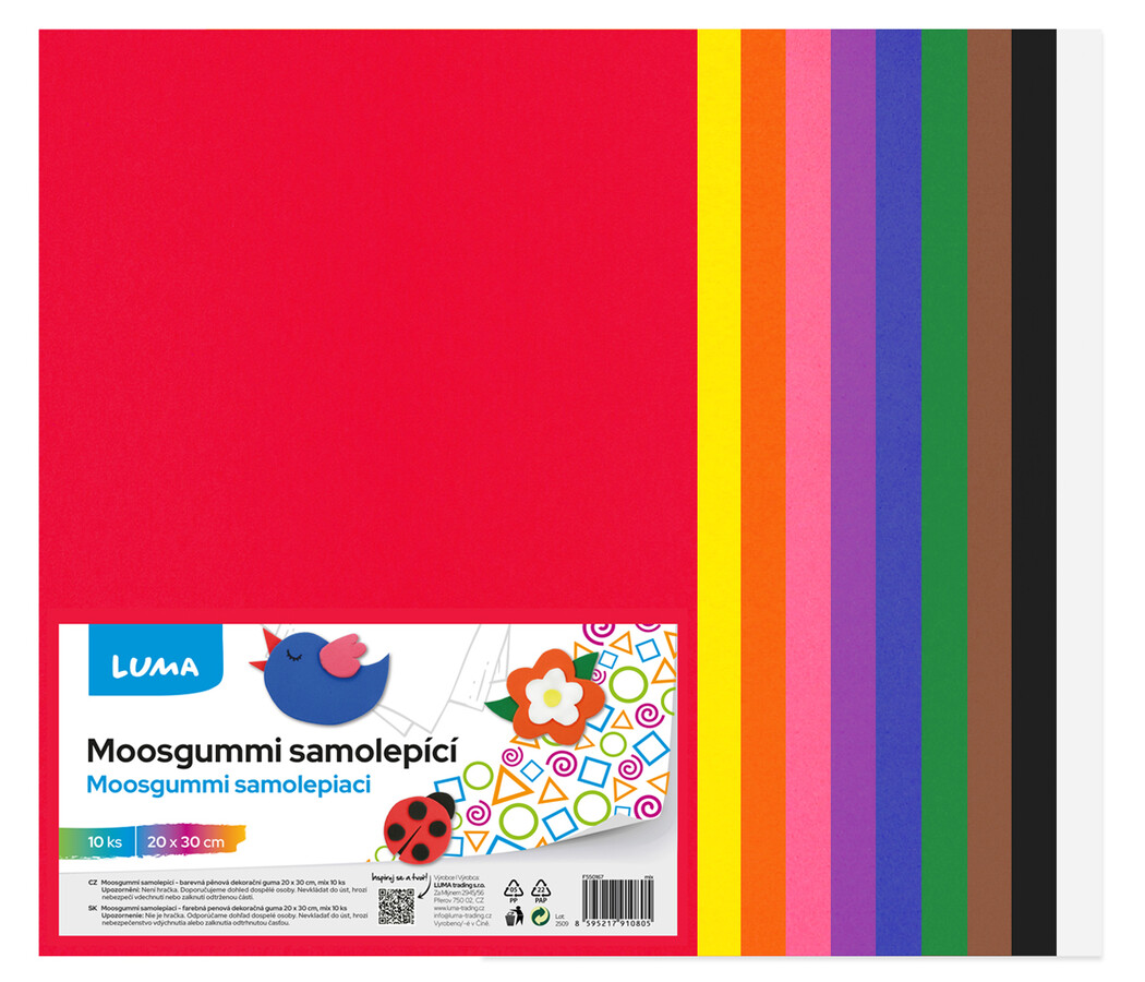 - samolepící pěnová guma - moosgummi - měkká a poddajná - mix barev - vhodná na výrobu razítek, zvířátek, masek i při tvorbě nejrůznějších stálebarevných a voděodolných dekorací - rozměr: A4 - 20 x 30cm 10 barev - tloušťka: 2mm