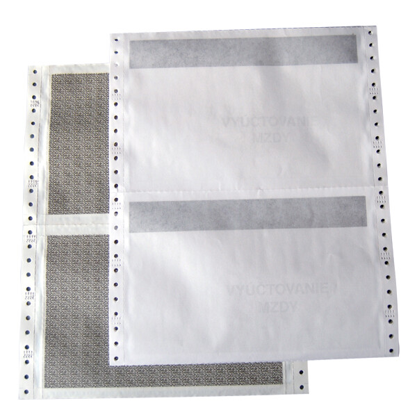 Mzdové obálky jsou vyrobeny jako tabelační papír 25x12"/6" 1+2. Po vytištění mzdových údajů se vrchní originál oddělí a zůstává v účtárně. Na první kopii se přes propisovací pruh propíše jen část údajů (např. jméno zaměstnance, výplatní období). Diskrétní údaje zůstávají uzavřené a utajené až na druhé kopii. V balení je 1000 ks obálek.