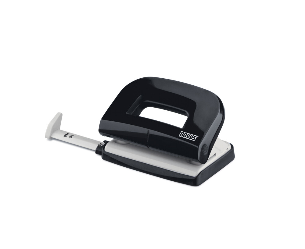 Malá děrovačka pro domácnost a domácí kancelář. Potištěné posuvné pravítko pro snadné formátování. Kovový spodní díl a plastový horní díl.