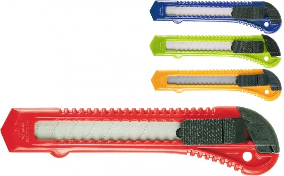 Velký ořezávací  odlamovací nůž s manuálně nastavitelnou vysouvací čepelí šíře 18 mm z ušlechtilé oceli, tělo nože z PVC, mix barev.