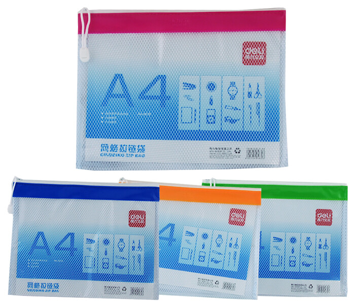 Spisový průhledný obal uzavíratelný na zip v síťovaném provedení. Slouží pro uložení dokumentů do formátu A4. Formát: A4 Materiál: PVC, prošitý Mix barev