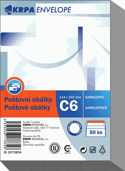 Obálka C6 114x162mm bílá, samolepicí klopy, 50 ks v bal.