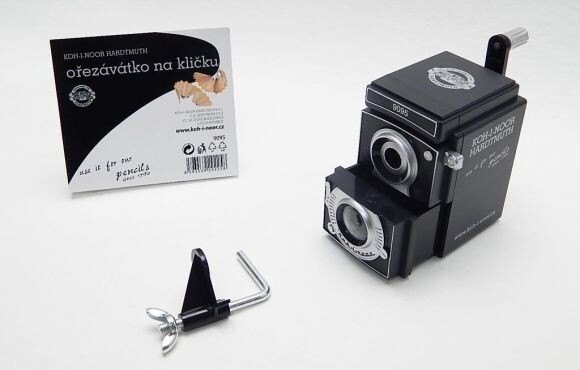 Stolní ořezávátko Koh-i-noor v retro designu fotoaparátu. Ořezávátko má upínací mechanismus na stolní desku, spodní část je protiskluzová. Frézový způsob ořezání hrotu tužky vytvoří pravidelnou ostrou špičku. Čelisťová přítlačná část zajišťuje dokonalé ořezání. Nastavitelný typ ořezání hrotu v rozmezí 0,06 až 2,0 mm. Pro tužky a pastelky do průměru 11,6 mm. Ořezávátko vám bude připomínat kouzlo starých časů a zároveň ozdobí interiér jako stylový doplněk s dokonalým designem.