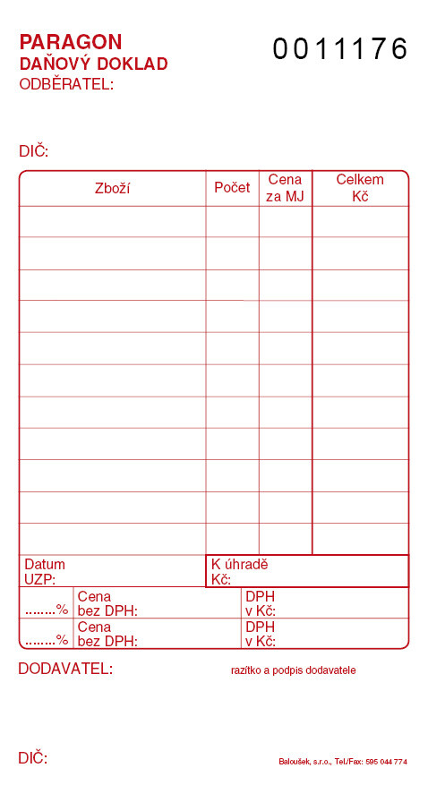 Paragon-daňový doklad číslovaný 50 listů, 80x150mm, přímopropisující tiskopis.