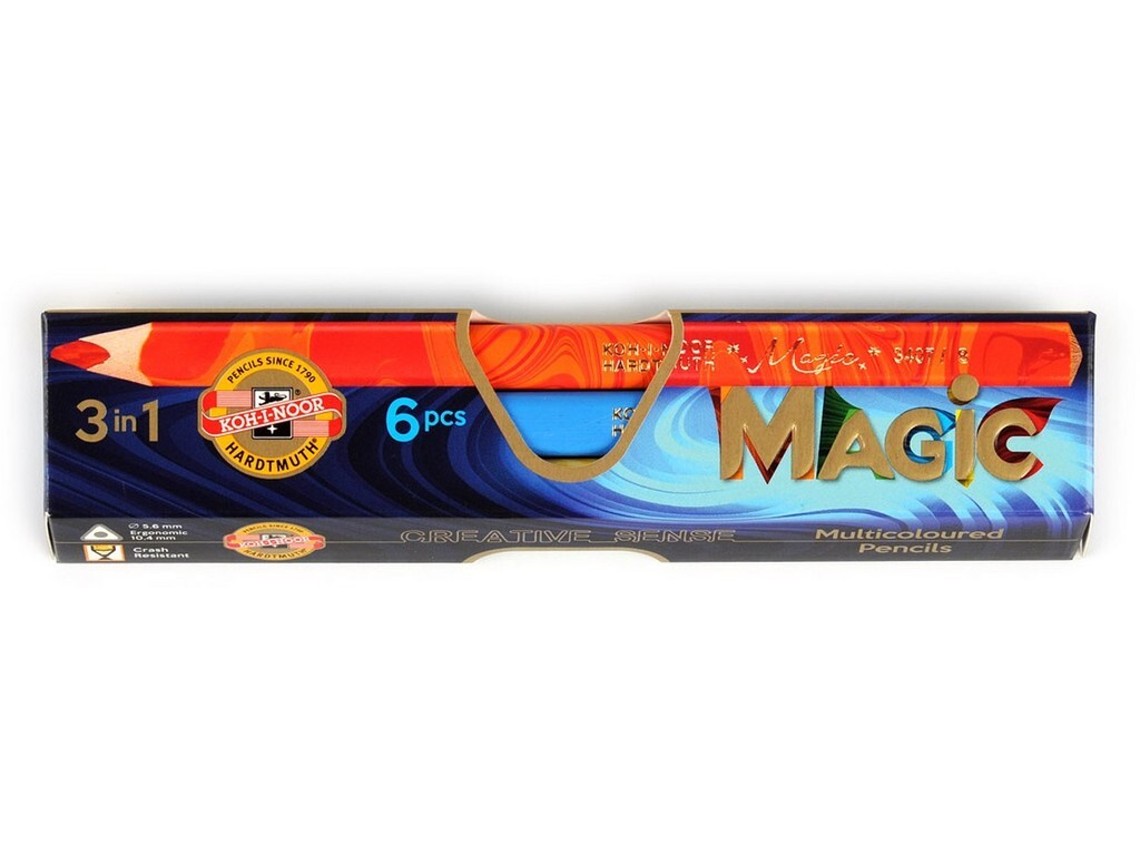 Speciální tužky s multibarevným jádrem složeným do barevné šachovnice, které vytváří různobarevnou měňavou stopou, trojhranné průměr 11 mm, 6 barev.