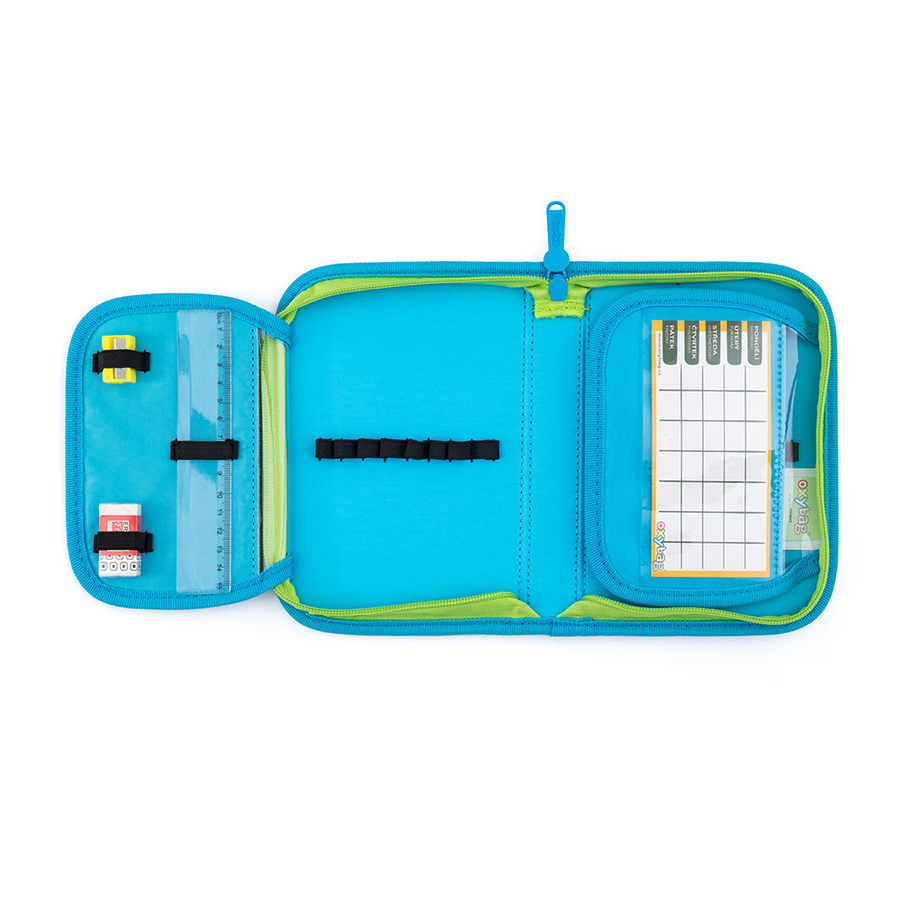 Jednopatrový školní penál se 2 chlopněmi, prázdný obsahuje 25 gumových poutek pro uchycení psacích potřeb. Na vnitřních chlopních jsou průhledné fólie pro rozvrh hodin. Rozměry: 13,5x20,5x4 cm.