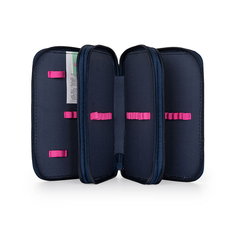 Školní penál třípatrový bez náplně. Penál obsahuje 40 gumových poutek pro uložení všech psacích potřeba a drobností potřebných k výuce. Penál má pevný zip s velkými taháčky pro snadnou manipulaci. Jedno patro je opatřeno průhlednou přihrádkou pro týdenní rozvrh. Rozměry 20x13x7 cm.