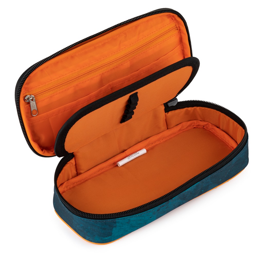 Pouzdro je opatřeno pevnými zipy, kapsičkou na zip a klopou s pevnými poutky po obou stranách. Pod klopou je místo pro volné uložení psacích potřeb nebo jiných drobností. Vhodné pro školáky na 2. stupni a starší studenty. Rozměry 20,5x10x5 cm.