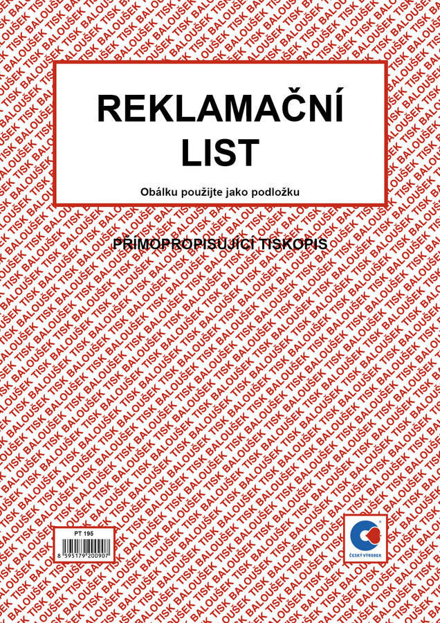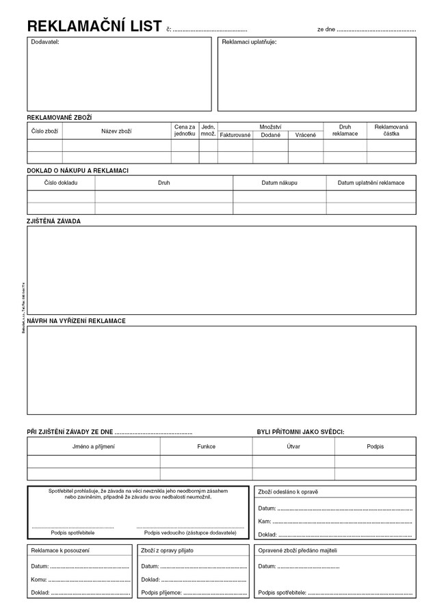Reklamační list 50 listů, formát A5, přímopropisující tiskopis.