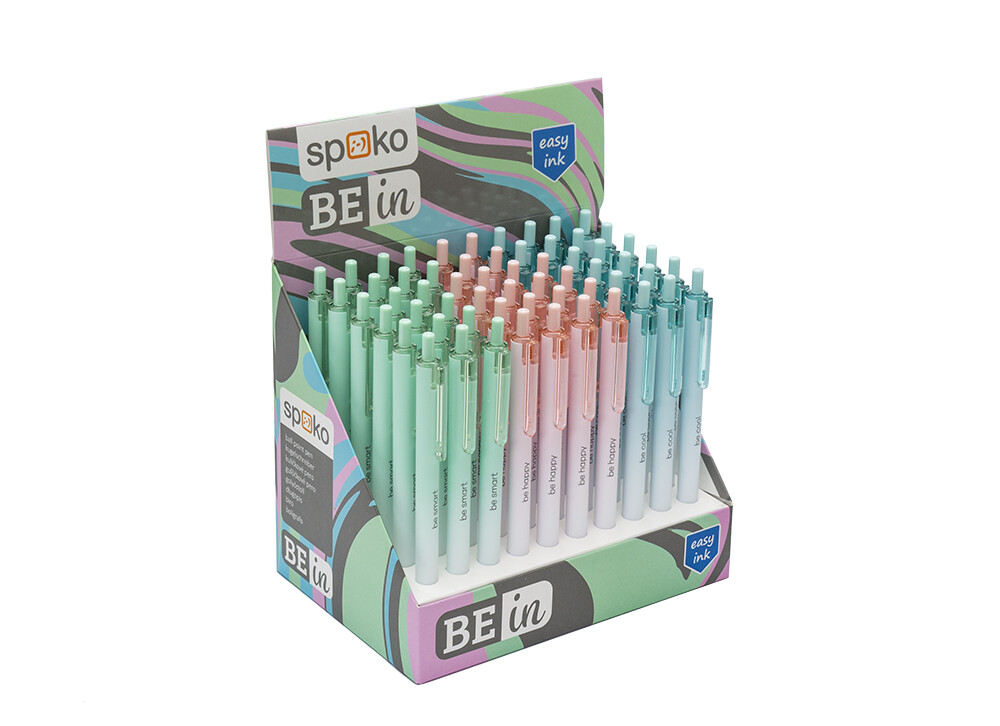 Tenké kuličkové pero v pastelových barvách s potiskem: be happy, be smart, be cool. Odlehčené plastové tělo se sametově hladkým povrchem. Modrá náplň Easy Ink - inkoust s nízkou viskozitou pro pohodlnější a plynulejší psaní. Dodáváno v barevném mixu 3 barev. Šířka stopy: 0,5 mm. Náhradní náplň: obj. č. S0297.