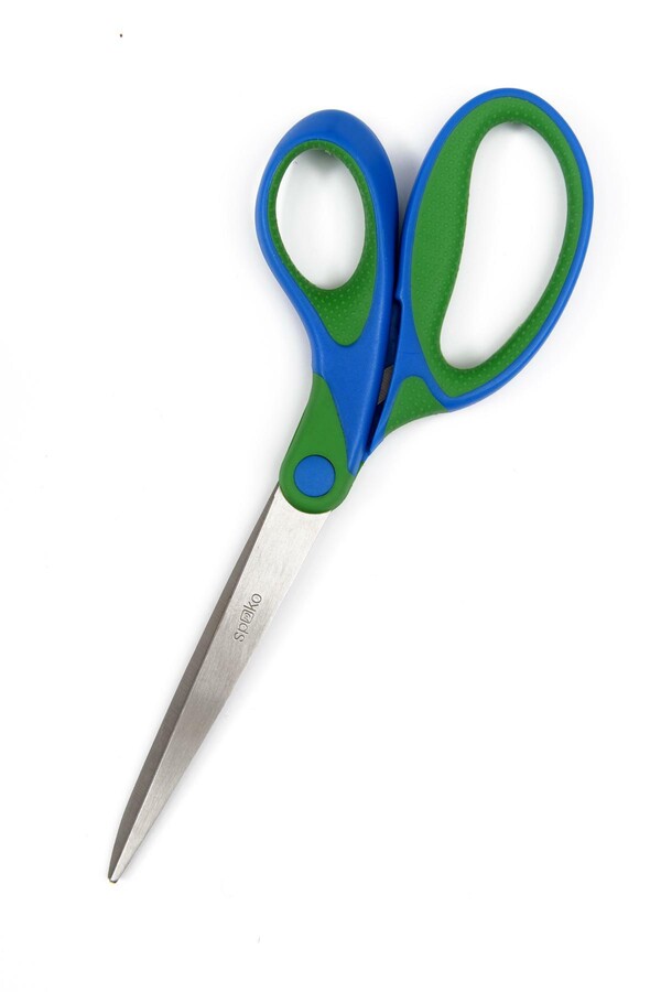 Kvalitně zpracované nerezové nůžky vel. 21 cm do každé kanceláře. Asymetrické rukojeti potažené barevným plastem - zelenomodrá kombinace, s drobnými body.