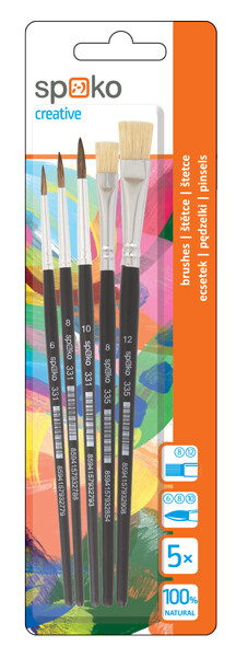 Praktická sada štětců s přírodním vlasem a štětinami pro školáky a volnočasové tvoření. Kombinace plochých a kulatých štětců. Dřevěná černá lakovaná násadka s tištěným logem a velikostí. Chromovaná mosazná zděř nekoroduje a udrží štětiny i při opakovaném vymývání.