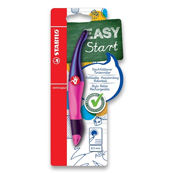 STABILO EASYoriginal se speciálním holografickým efektem. Ergonomický roller vč. náplně pro začínající písaře a školáky od 6 let byl vyvinut ve speciálních verzích pro leváky a praváky. Pero s neklouzavou úchopovou zónou ergonomicky sedí v ruce a podporuje uvolněné držení, které zabraňuje předčasné svalové únavě a napětí při psaní. Snadná manipulace umožňuje rukopis, který je čistý a úhledný – žádné kaňky, žádné škrábance. S každou novou bombičkou je dodáván nový psací hrot: snadné doplňování. Náplň: modrým zmizíkovací inkoust. Obsahuje také štítek na jméno. Uzávěr lze nasadit na konec pera.