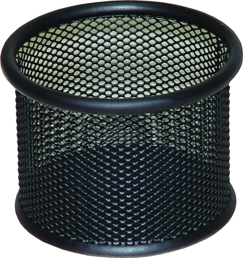 Jednoduchý kovový zásobník na psací potřeby v černém provedení, perforovaný. Stabilní. Snadná údržba. Rozměry: Ø 90 mm, výška 68 mm.