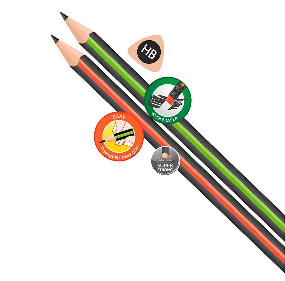 Grafitová tužka v oblíbeném trojhraném provedení pro pohodlné držení. Typ HB (č.2) vyhovuje běžnému použití - psaní i kreslení. Na konci pryž v barvě potisku. Mix barev. Balení: 48 ks/displej